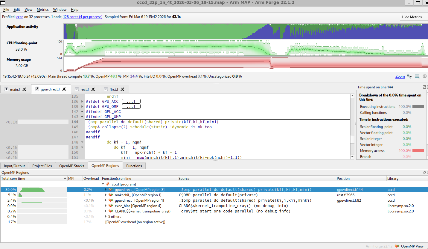 ARM MAP, on the other hand, was used for profiling. It provides insight into how the program spends its time, including CPU usage, MPI communication, and OpenMP regions. It answers a different question: why does a particular configuration perform the way it does?