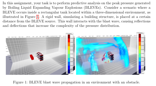 The goal of this assignment was to develop a machine learning model capable of predicting peak overpressure generated by Boiling Liquid Expanding Vapour Explosions (BLEVEs). These explosions pose significant safety risks during the transport of liquefied petroleum gas (LPG), particularly in urban environments. Traditional modeling approaches struggle to handle the complex physics involved, making this a fitting challenge for data-driven methods.